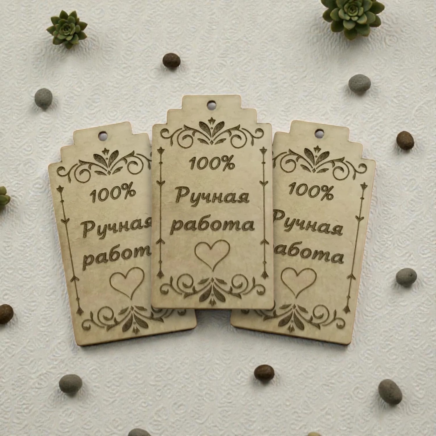 Используя бирки "Ручная работа" с лазерной гравировкой, вы не только указываете на то, что ваше изделие создано вручную, но и транслируете своё уважение к покупателю, предлагая ему не просто вещь, а частичку своего творчества.